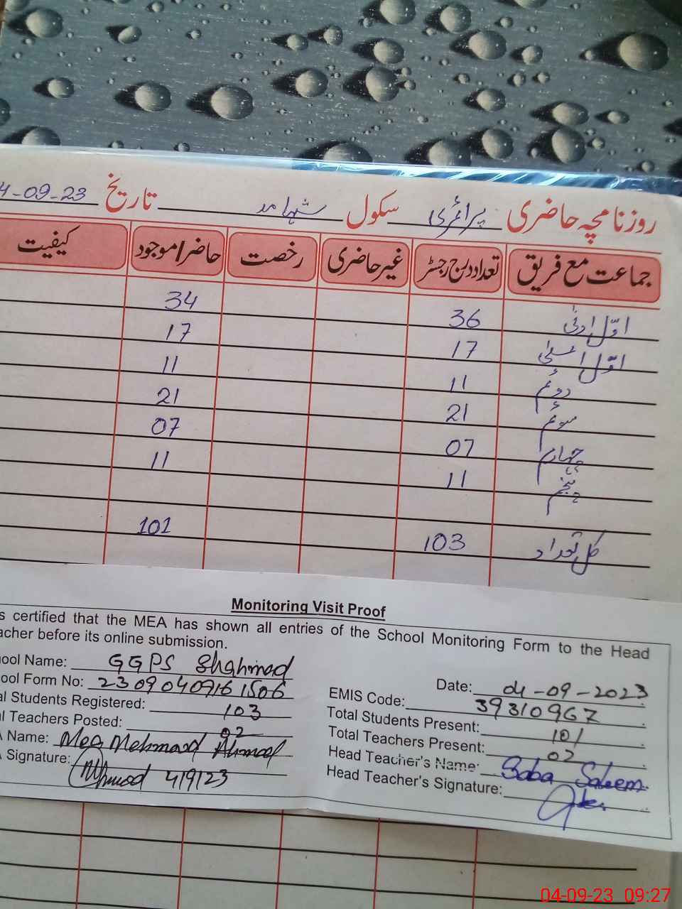 | Attendance Register | Head Teacher | MEA with School | Visit Proof |