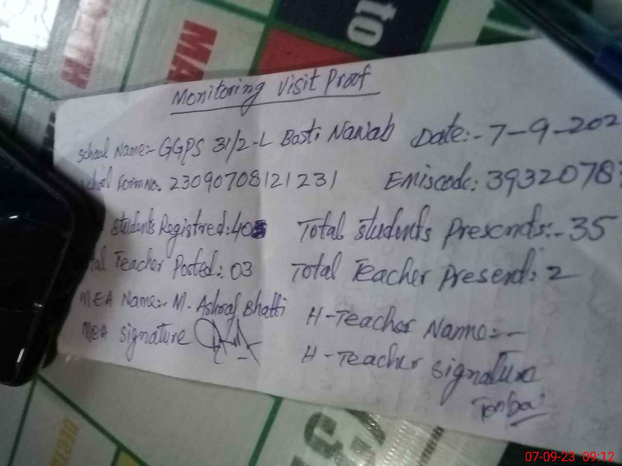 | Attendance Register | Head Teacher | MEA with School | Visit Proof |