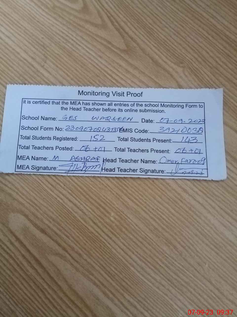| Attendance Register | Head Teacher | MEA with School | Visit Proof |