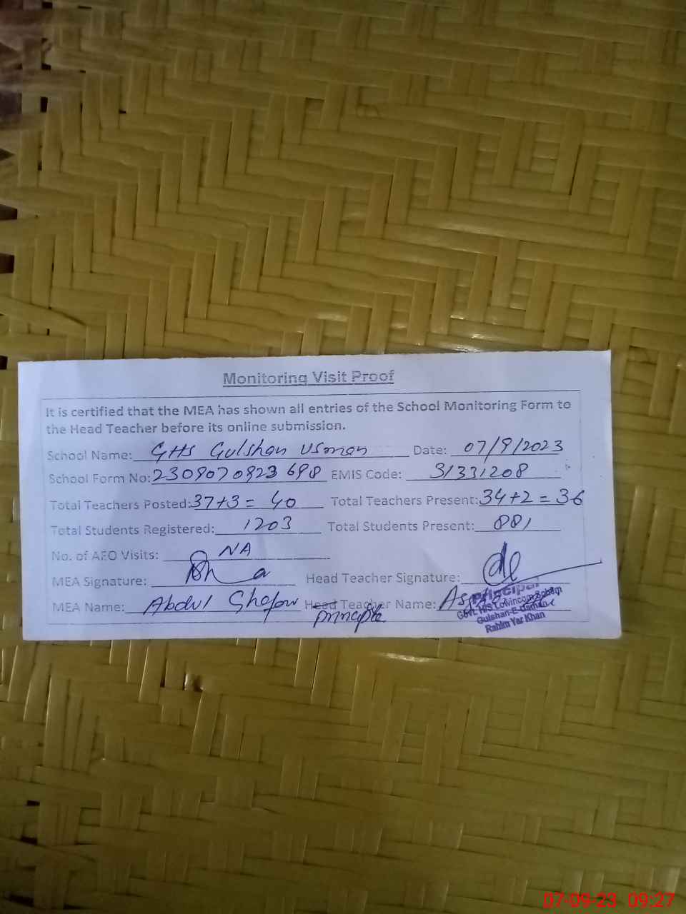 | Attendance Register | Head Teacher | MEA with School | Visit Proof |