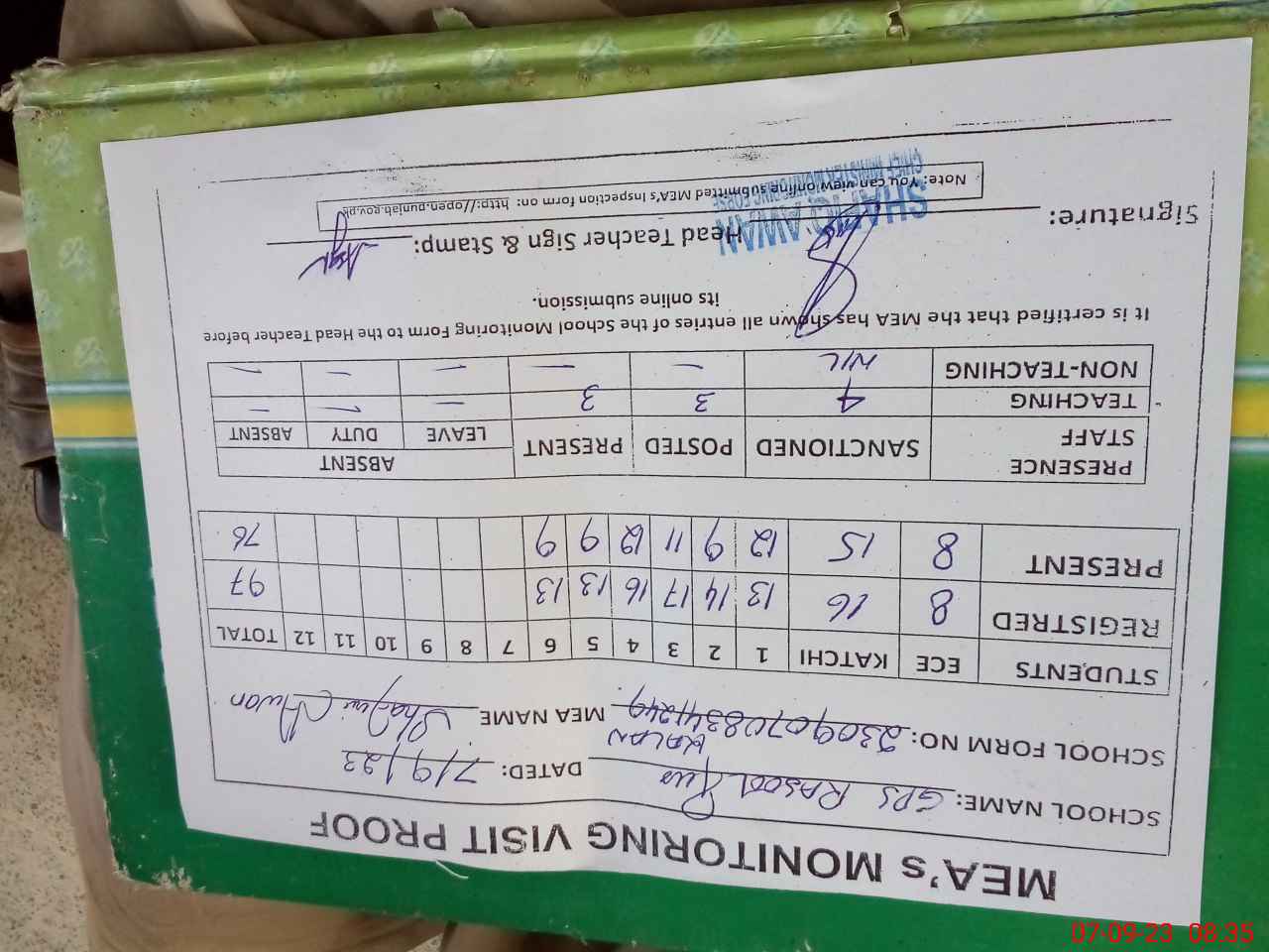 | Attendance Register | Head Teacher | MEA with School | Visit Proof |
