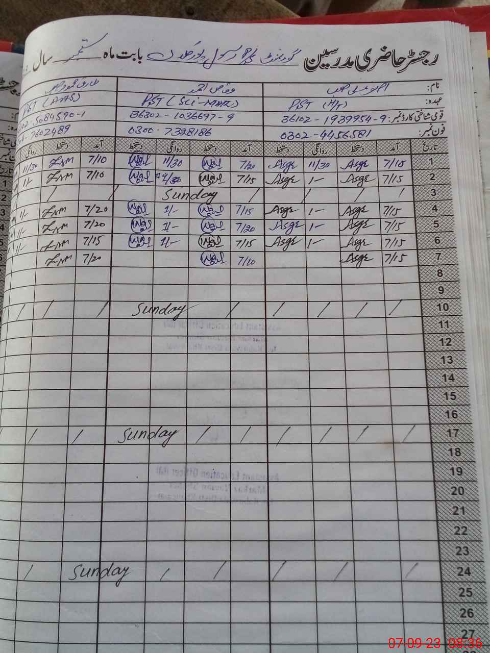 | Name: As**** Al**** Designation: (School Headmaster's/Headmistress's) PST Phone/Cell Number: 03**** |