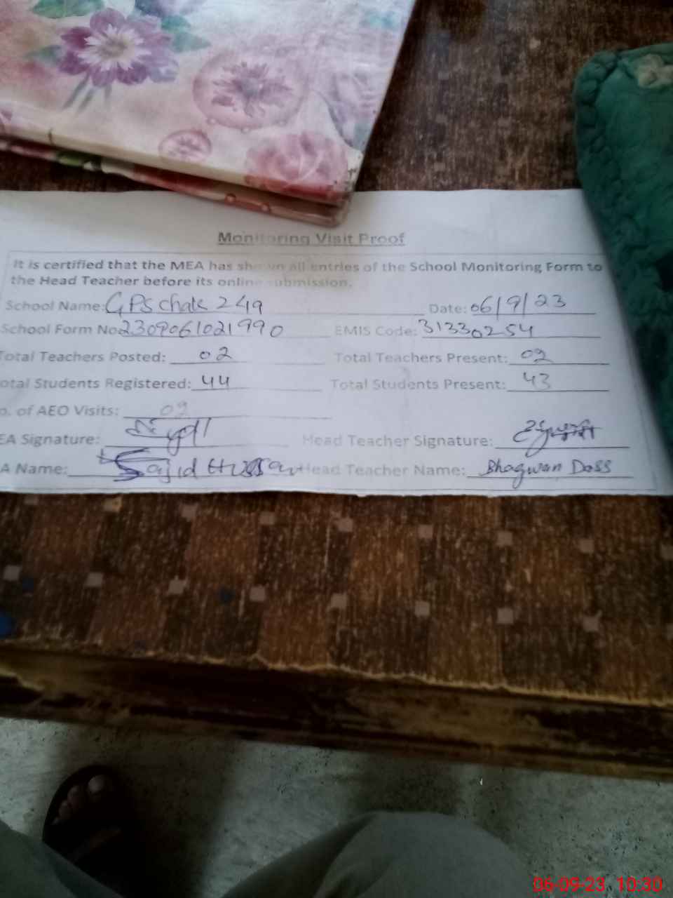 | Attendance Register | Head Teacher | MEA with School | Visit Proof |