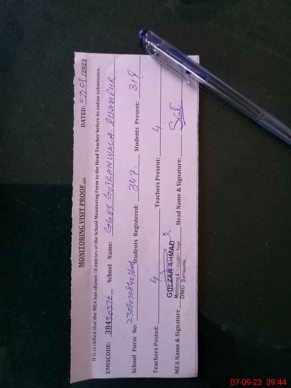 | Attendance Register | Head Teacher | MEA with School | Visit Proof |