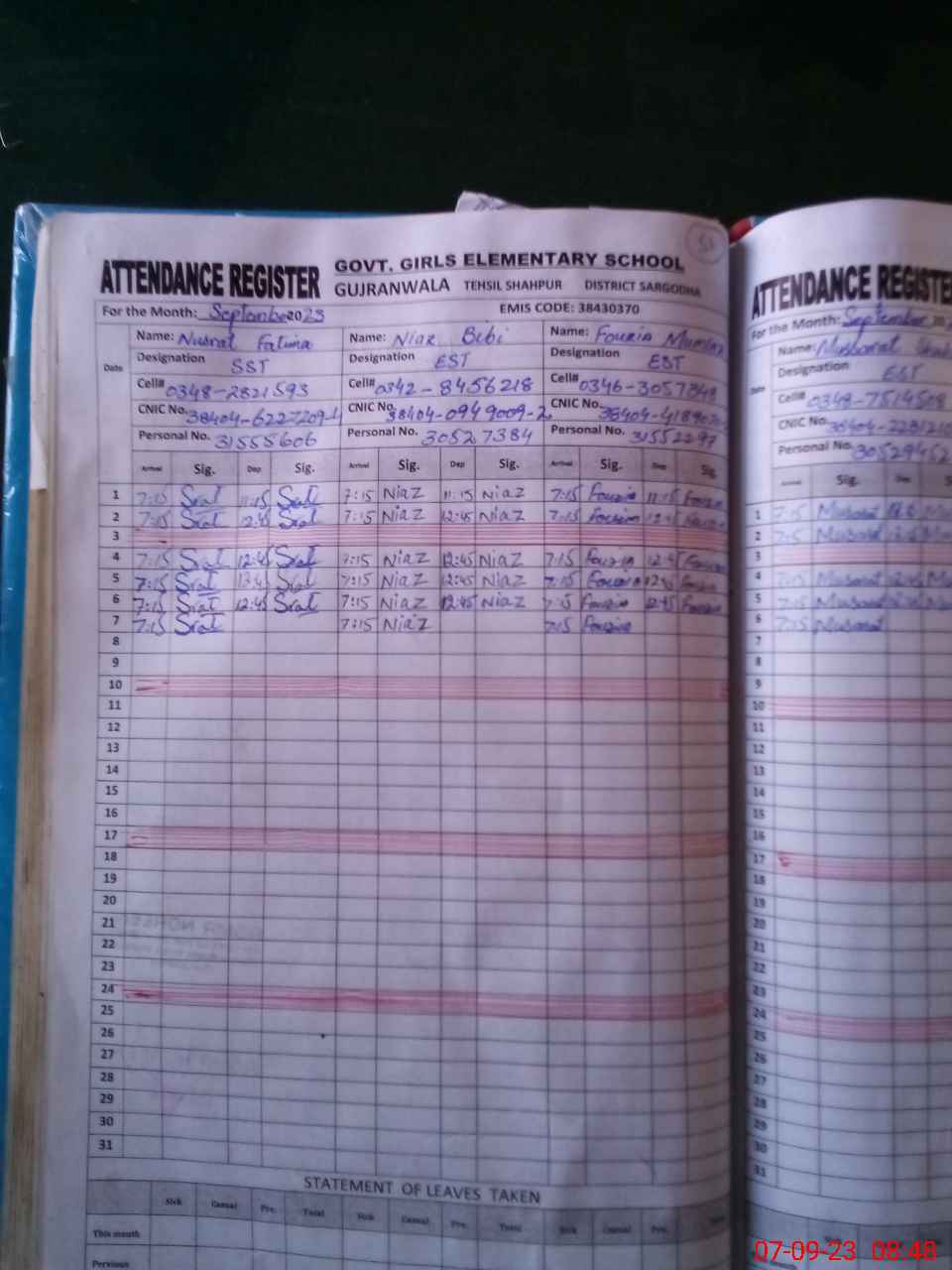| Name: NU**** FA**** Designation: (School Headmaster's/Headmistress's) SST (SCIENCE) Phone/Cell Number: 03**** |