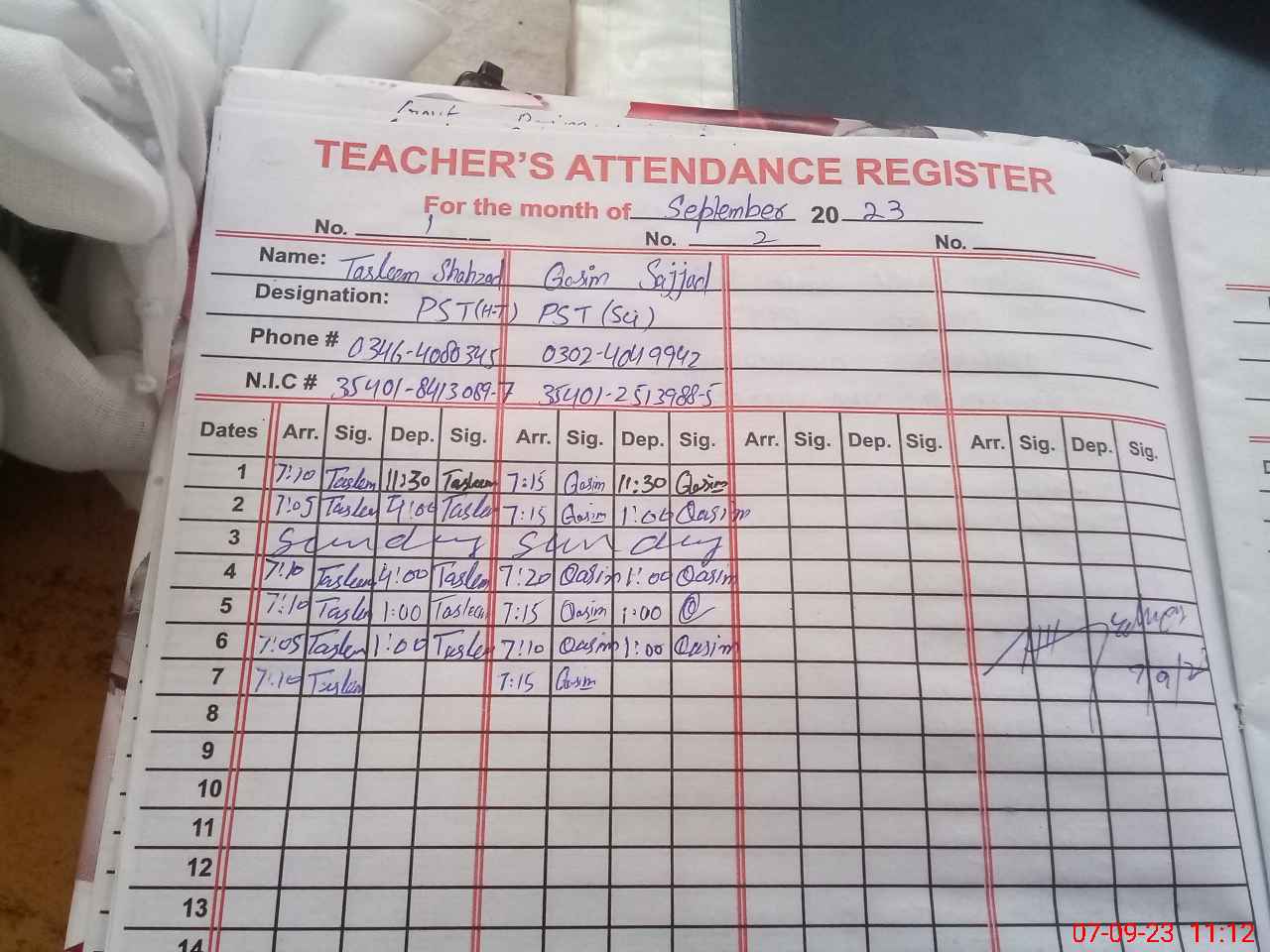 | CNIC | Full Name | Designation | R/C | Absence During Last Calender Month |