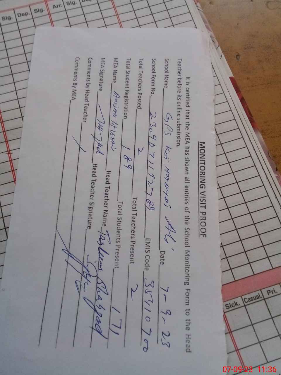| Attendance Register | Head Teacher | MEA with School | Visit Proof |