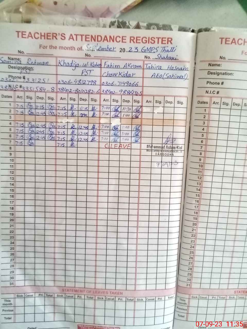 | CNIC | Full Name | Designation | R/C | Absence During Last Calender Month |