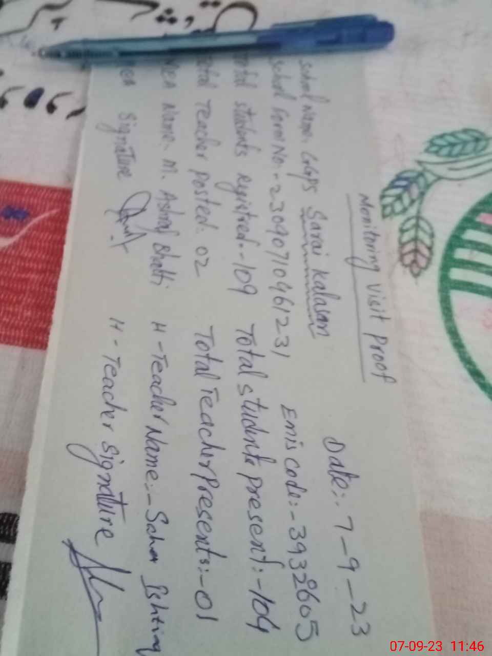 | Attendance Register | Head Teacher | MEA with School | Visit Proof |