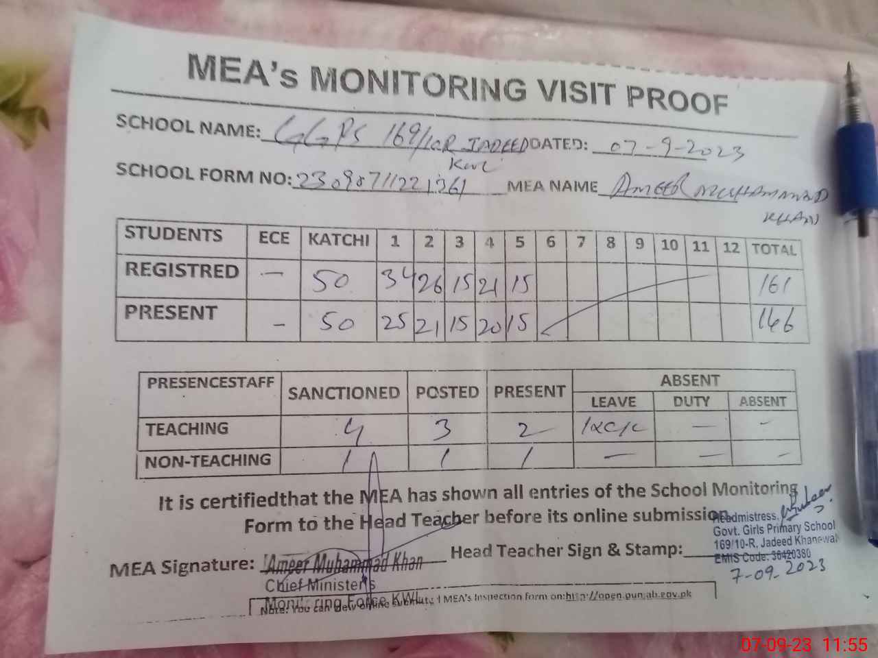 | Attendance Register | Head Teacher | MEA with School | Visit Proof |
