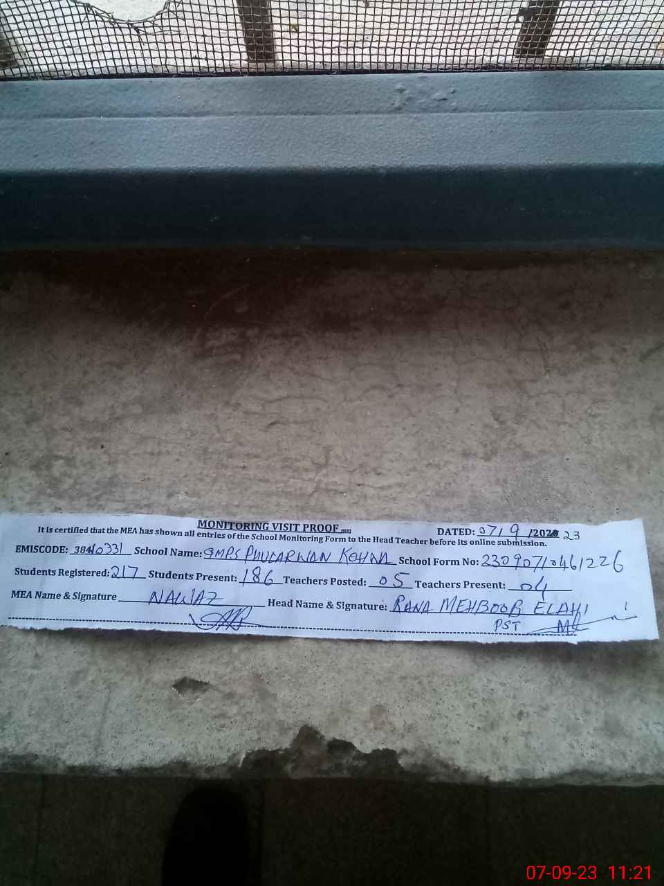 | Attendance Register | Head Teacher | MEA with School | Visit Proof |