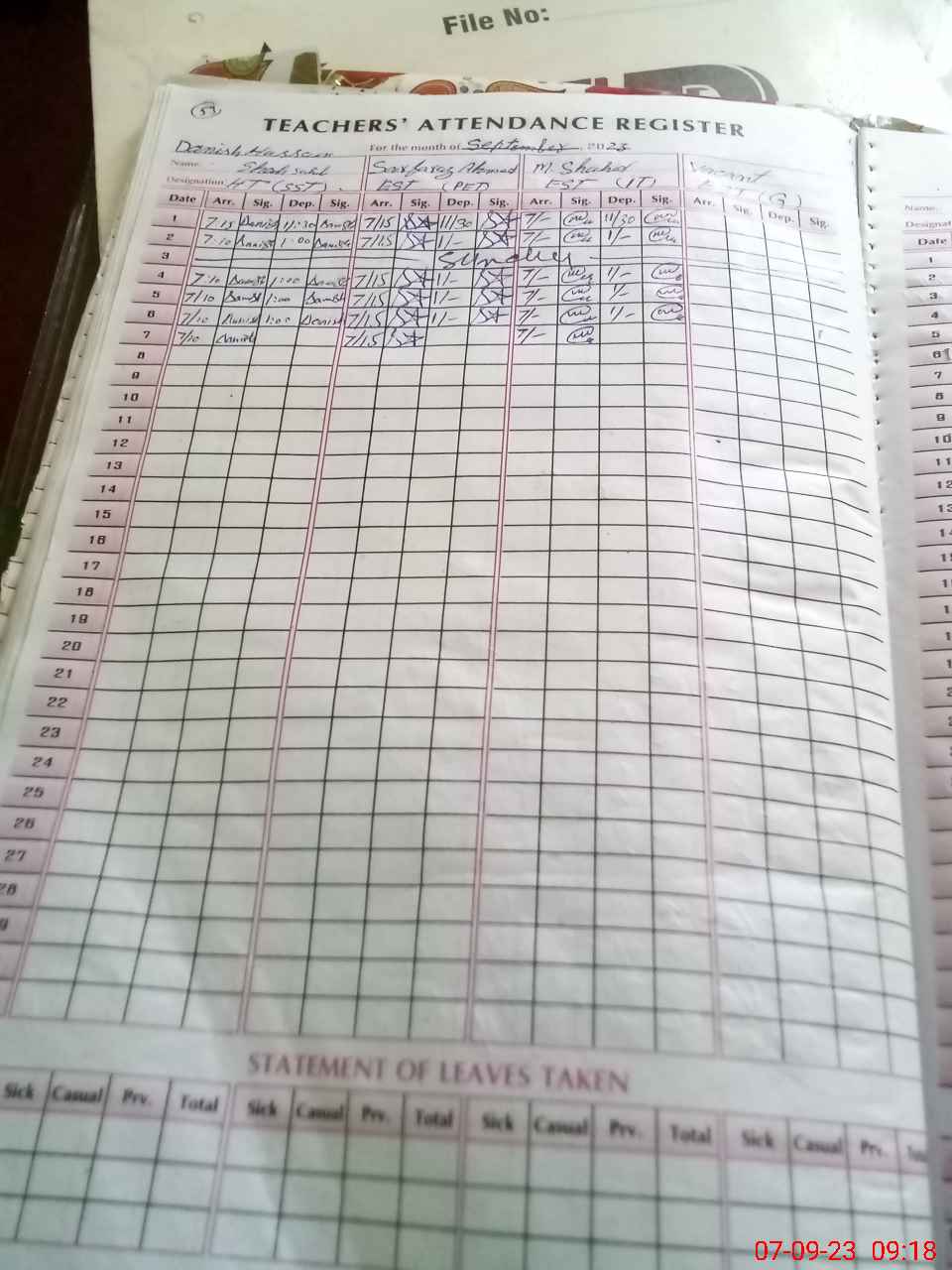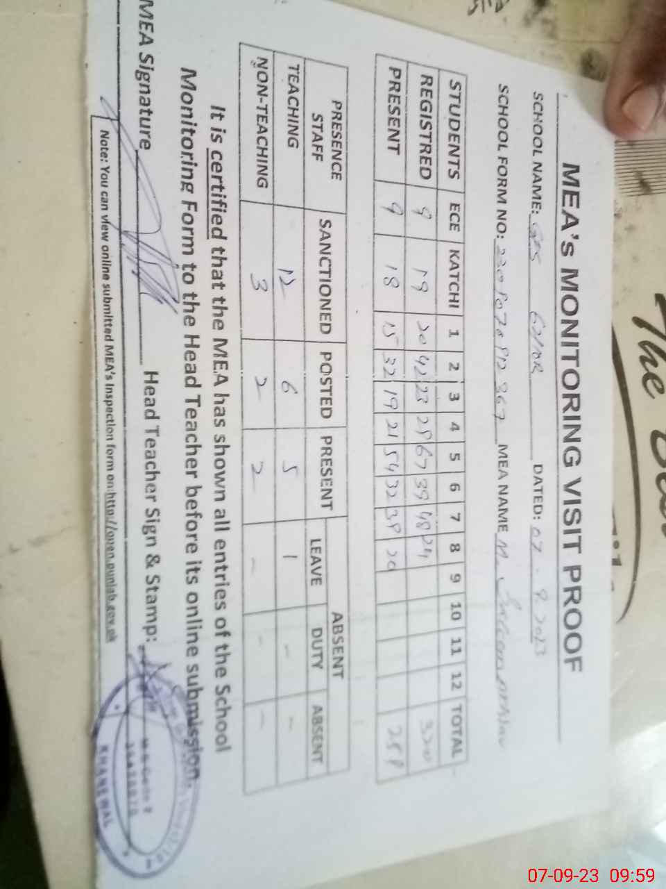 | Attendance Register | Head Teacher | MEA with School | Visit Proof |