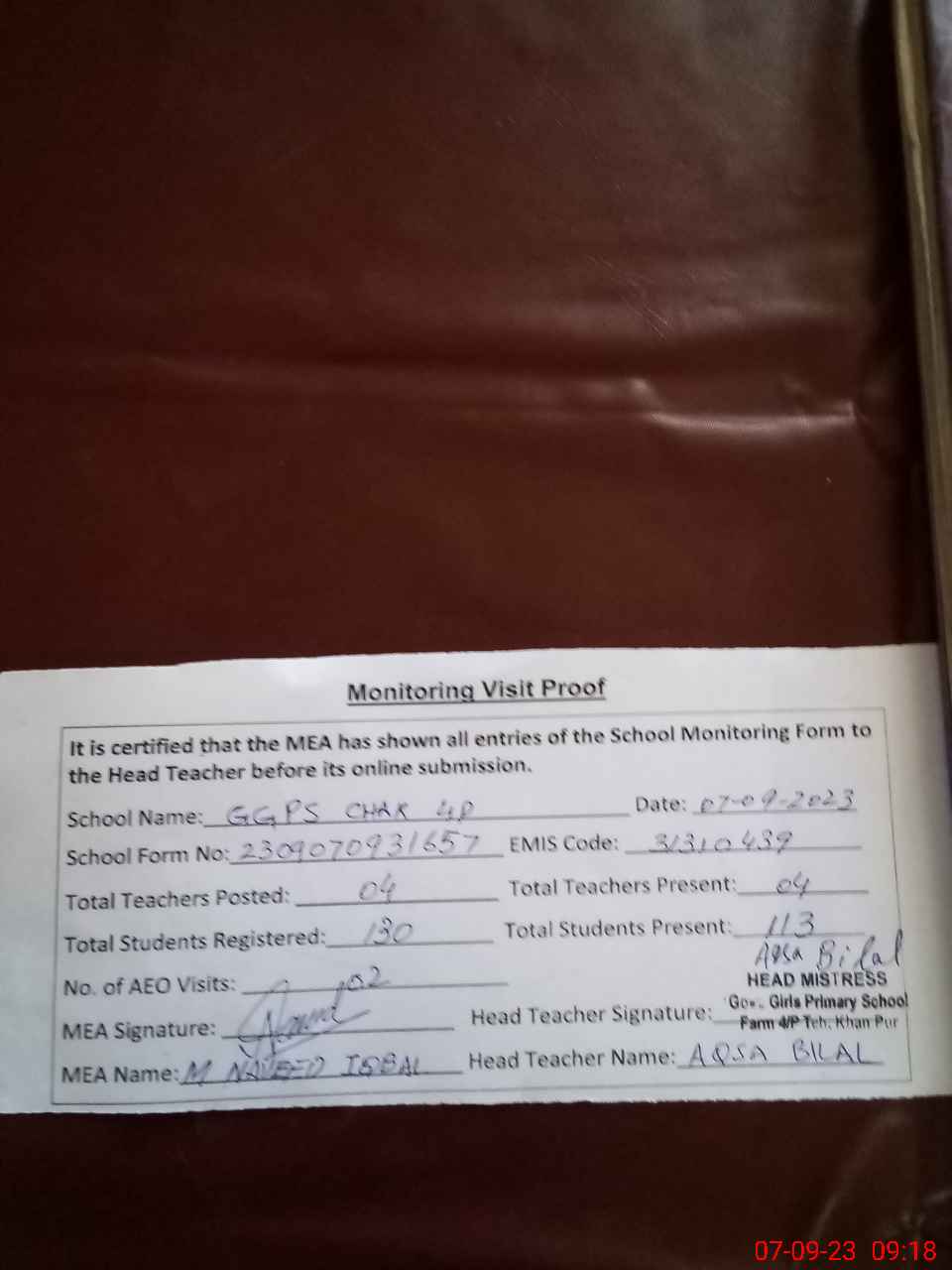 | Attendance Register | Head Teacher | MEA with School | Visit Proof |