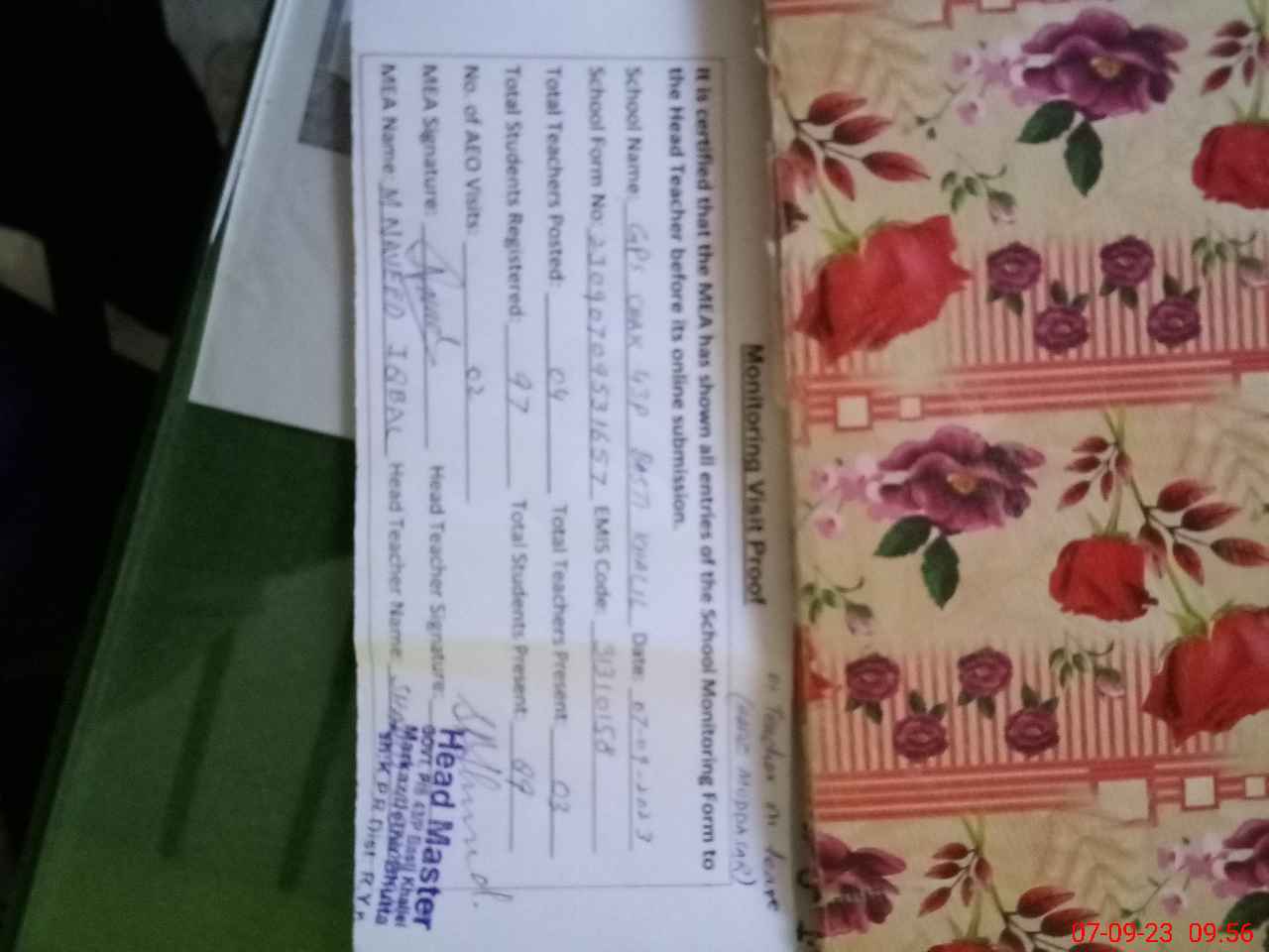 | Attendance Register | Head Teacher | MEA with School | Visit Proof |