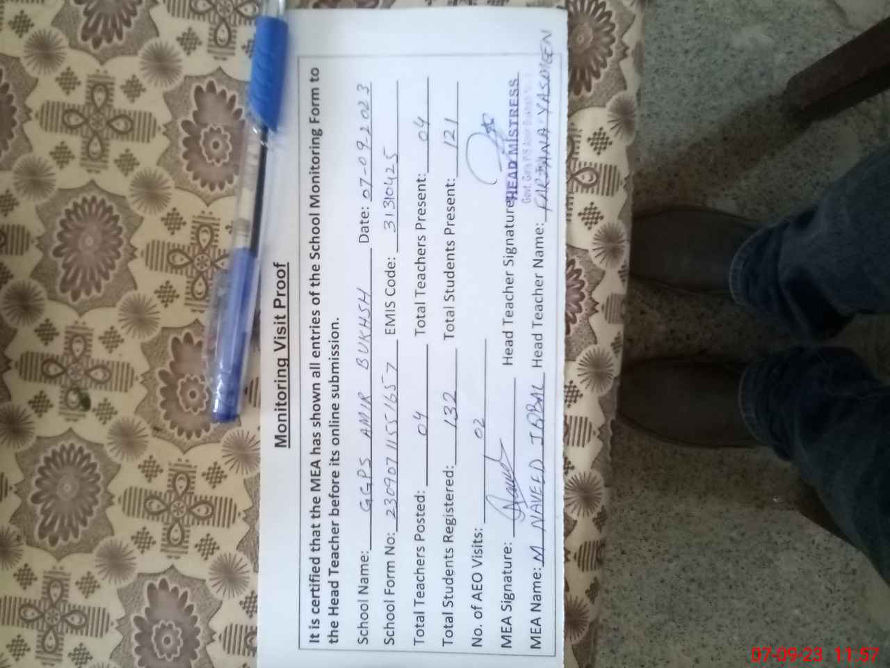 | Attendance Register | Head Teacher | MEA with School | Visit Proof |