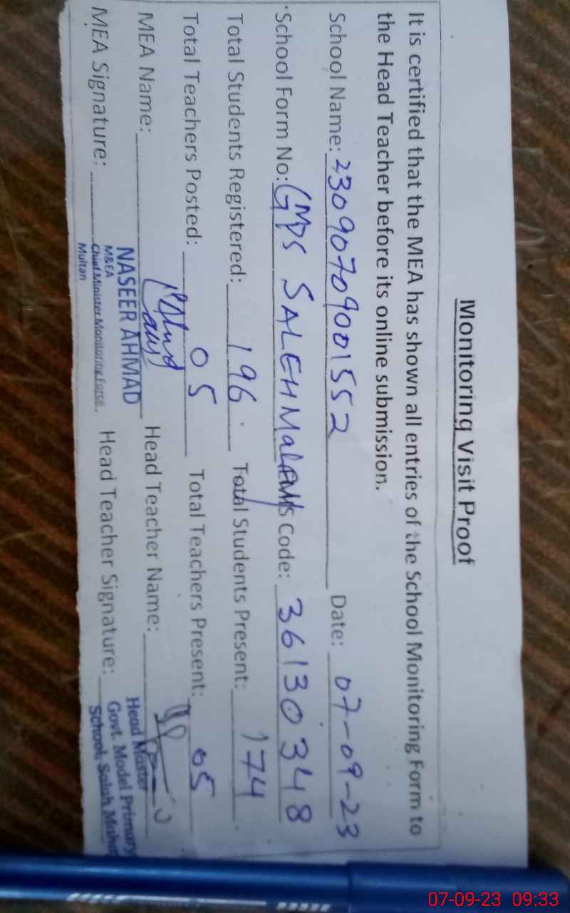 | EMIS Code: 36130348 | Name of School: GMPS SALEH MEHAY POST BOX NAWAB PUR | |||