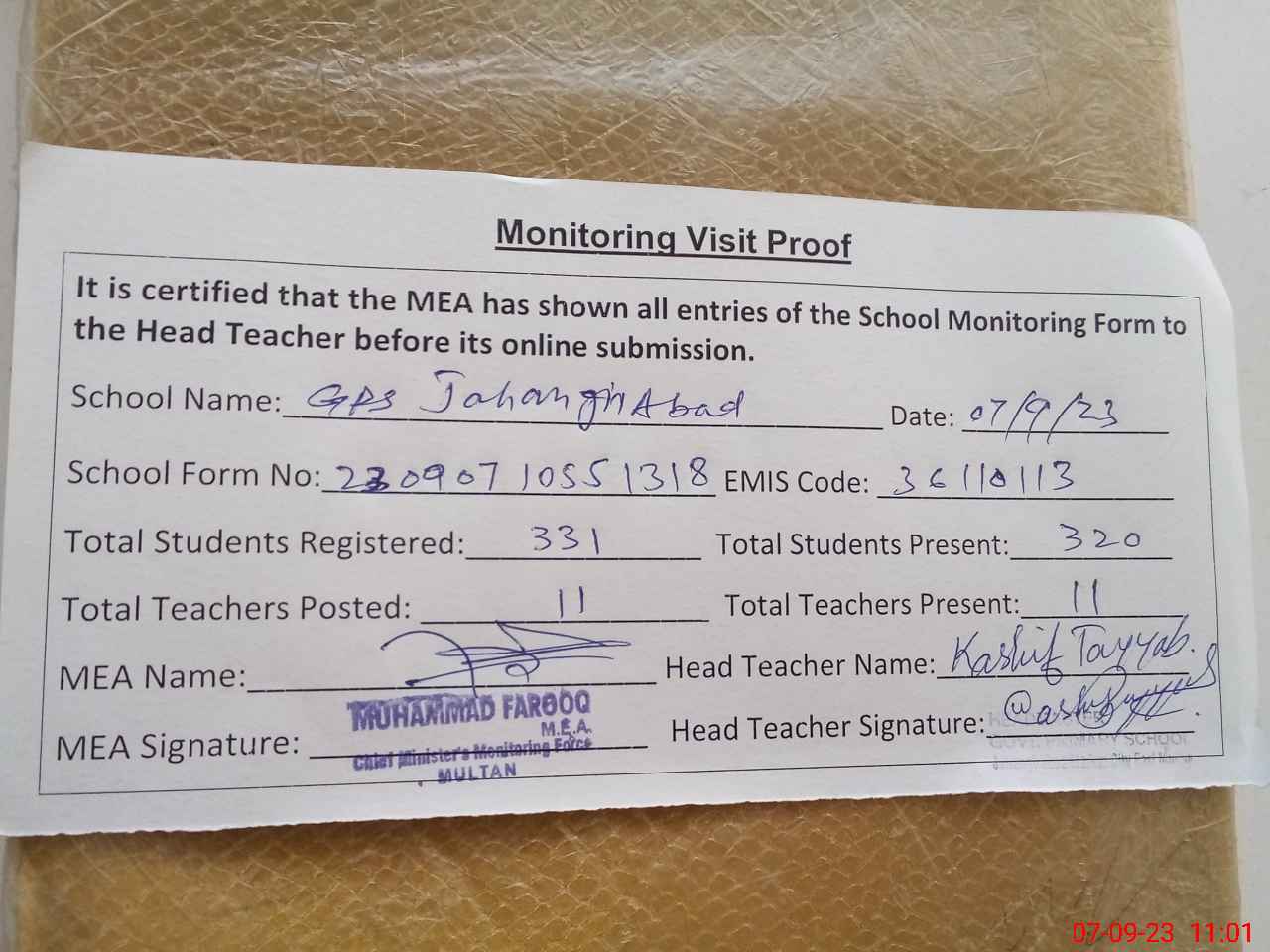 | Attendance Register | Head Teacher | MEA with School | Visit Proof |