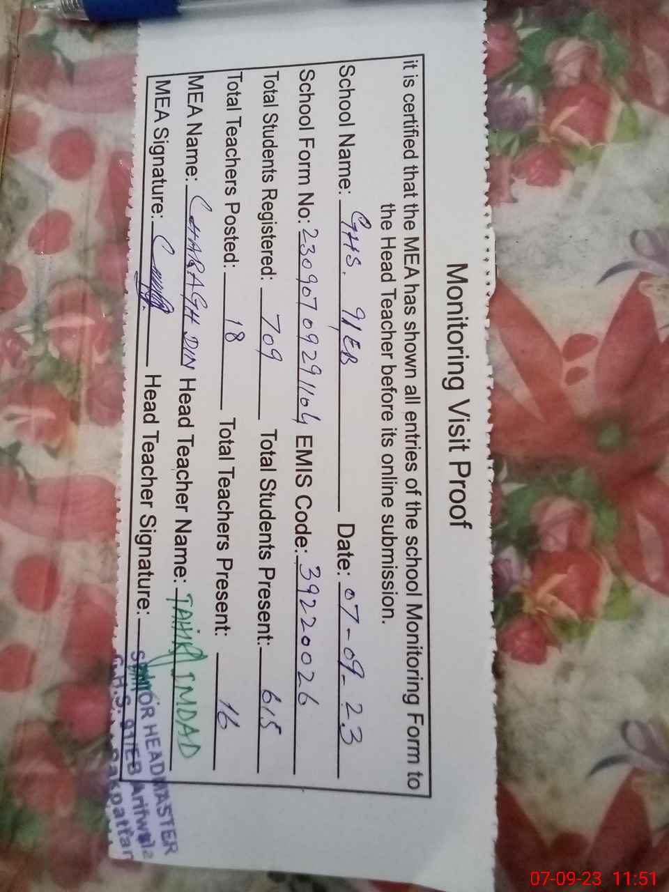 | Name: TA**** IM**** Designation: (School Headmaster's/Headmistress's) S.HM Phone/Cell Number: 03**** |
