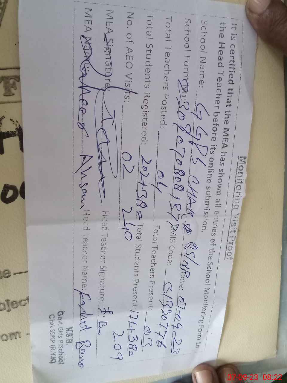 | Attendance Register | Head Teacher | MEA with School | Visit Proof |