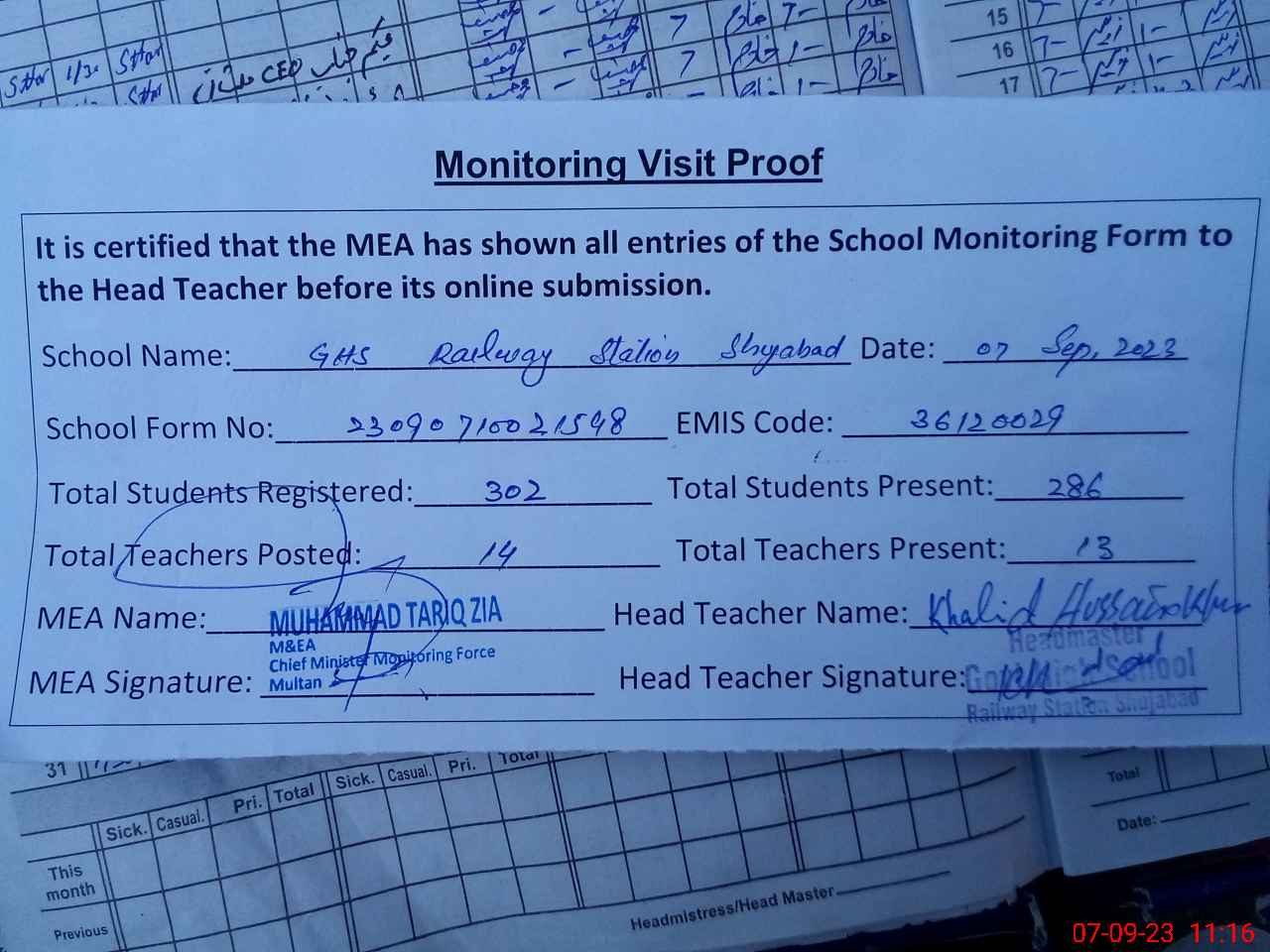 | Attendance Register | Head Teacher | MEA with School | Visit Proof |