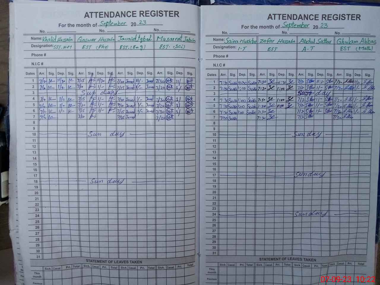 | CNIC | Full Name | Designation | R/C | Absence During Last Calender Month |