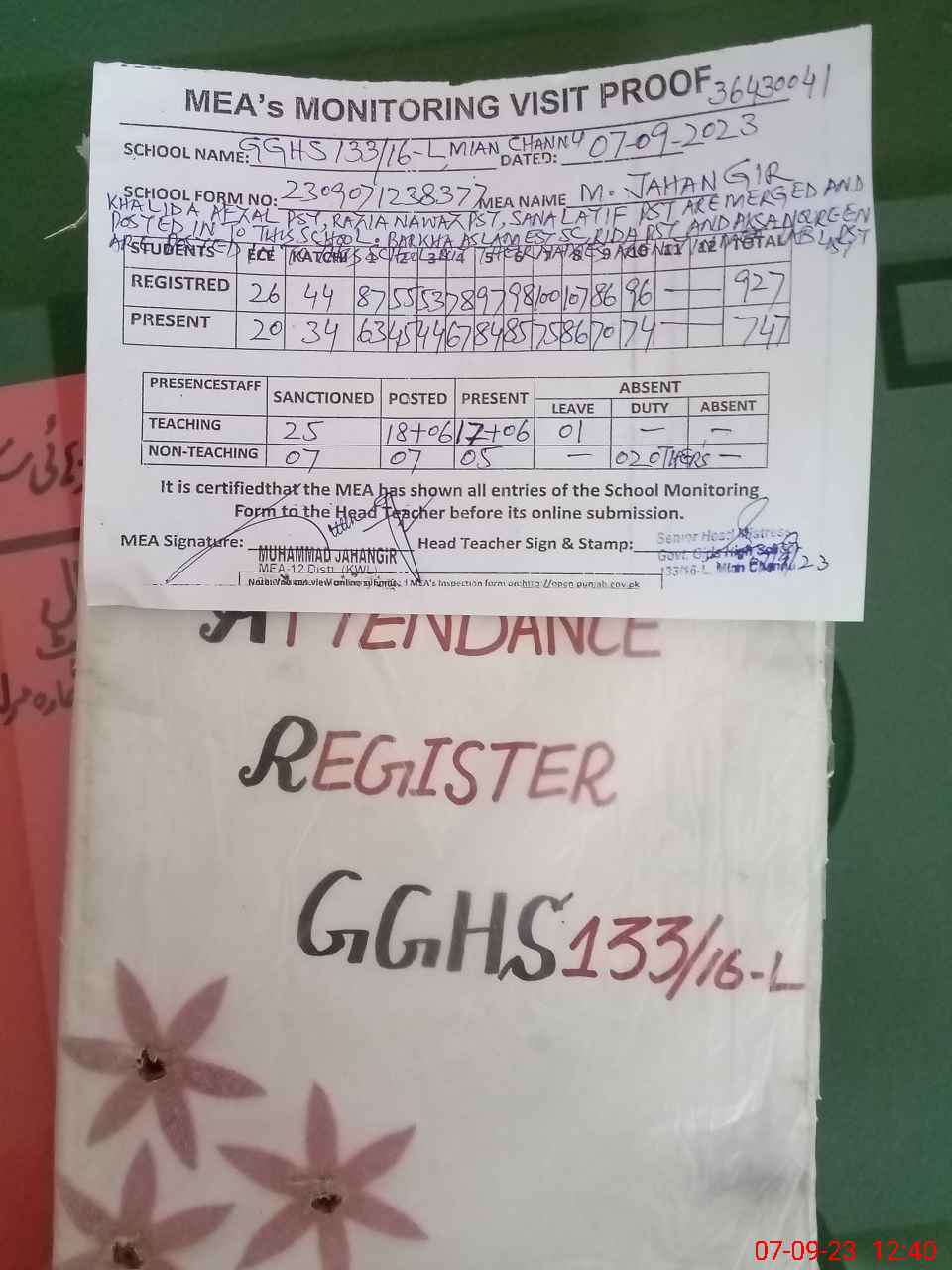 | EMIS Code: 36430041 | Name of School: GGHS 133/16-L, MIAN CHANNU | |||