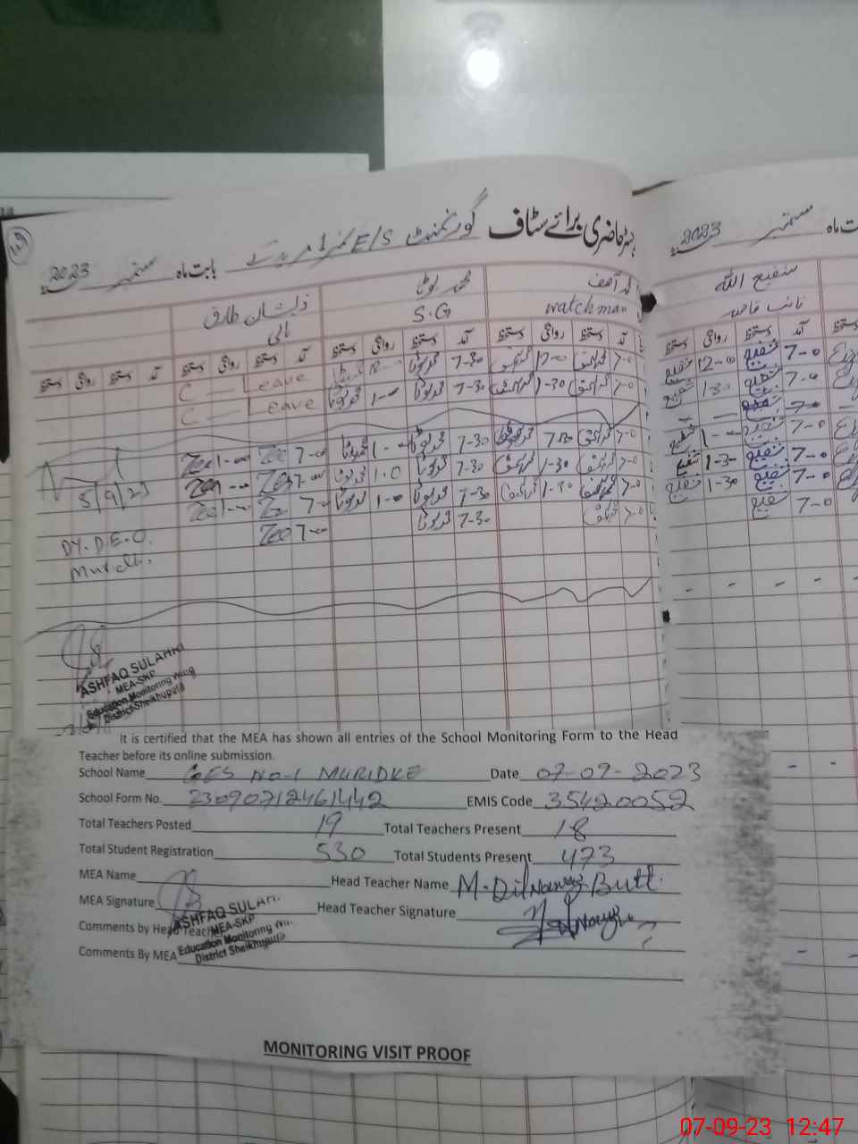 | Attendance Register | Head Teacher | MEA with School | Visit Proof |