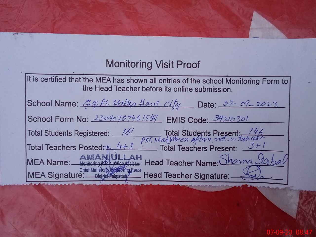 | EMIS Code: 39210301 | Name of School: GGPS MALKA HANS CITY | |||
