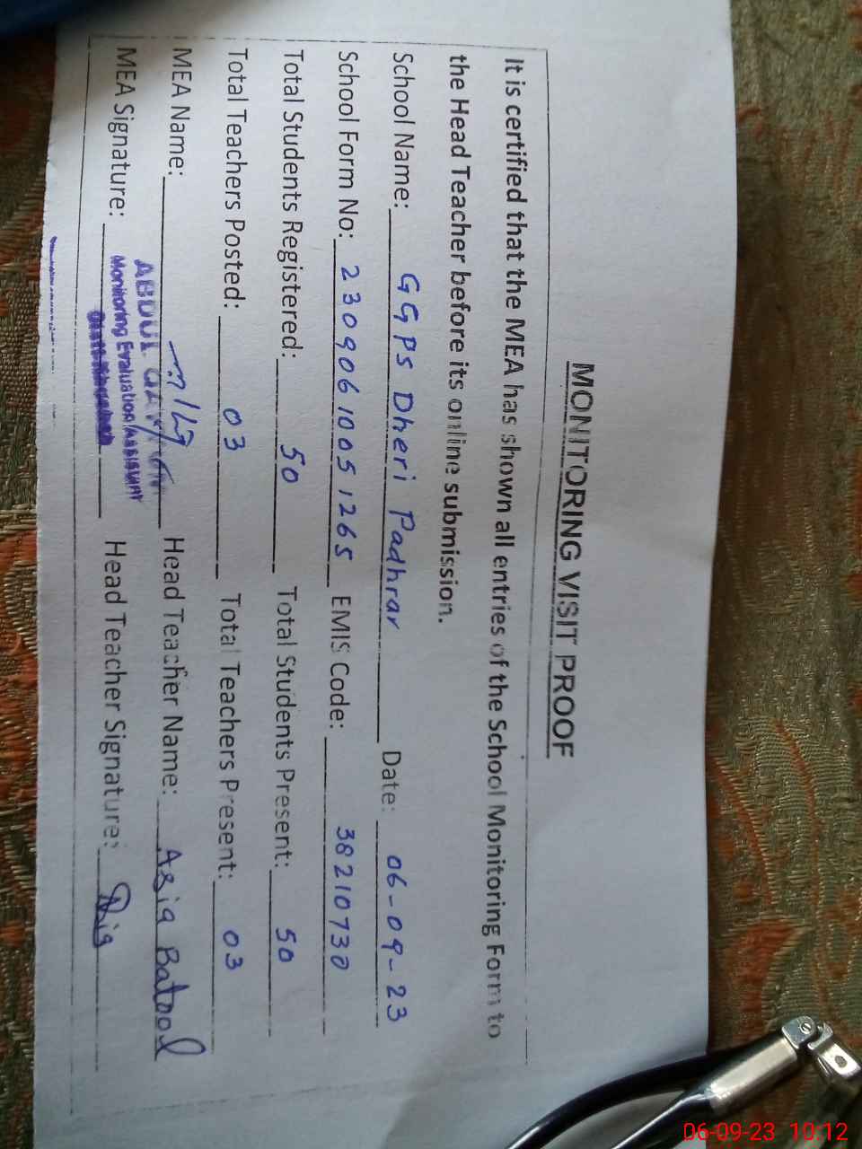 | Attendance Register | Head Teacher | MEA with School | Visit Proof |