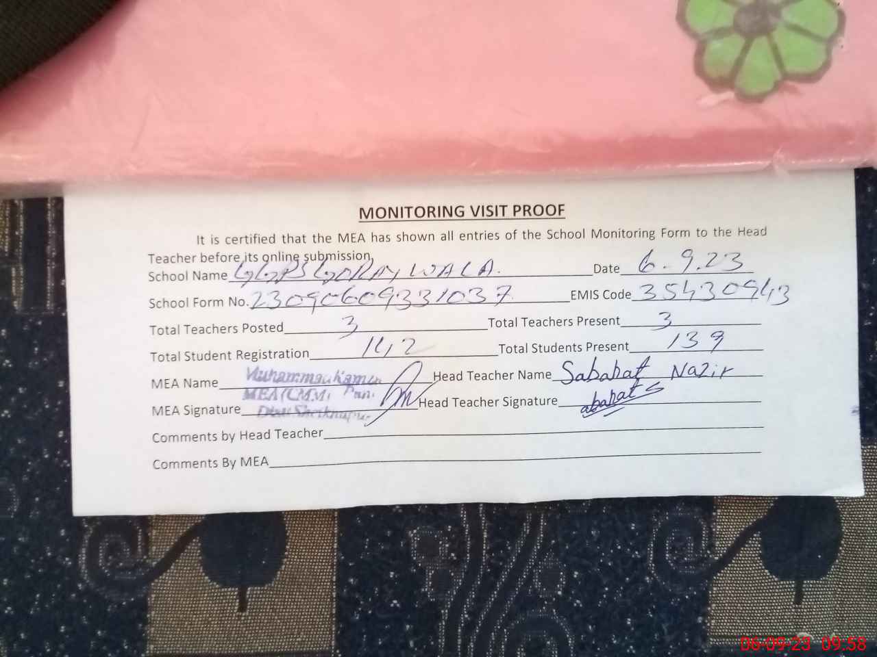 | Attendance Register | Head Teacher | MEA with School | Visit Proof |