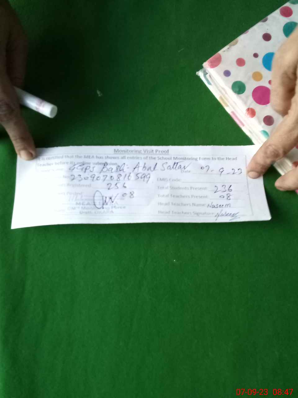 | Attendance Register | Head Teacher | MEA with School | Visit Proof |