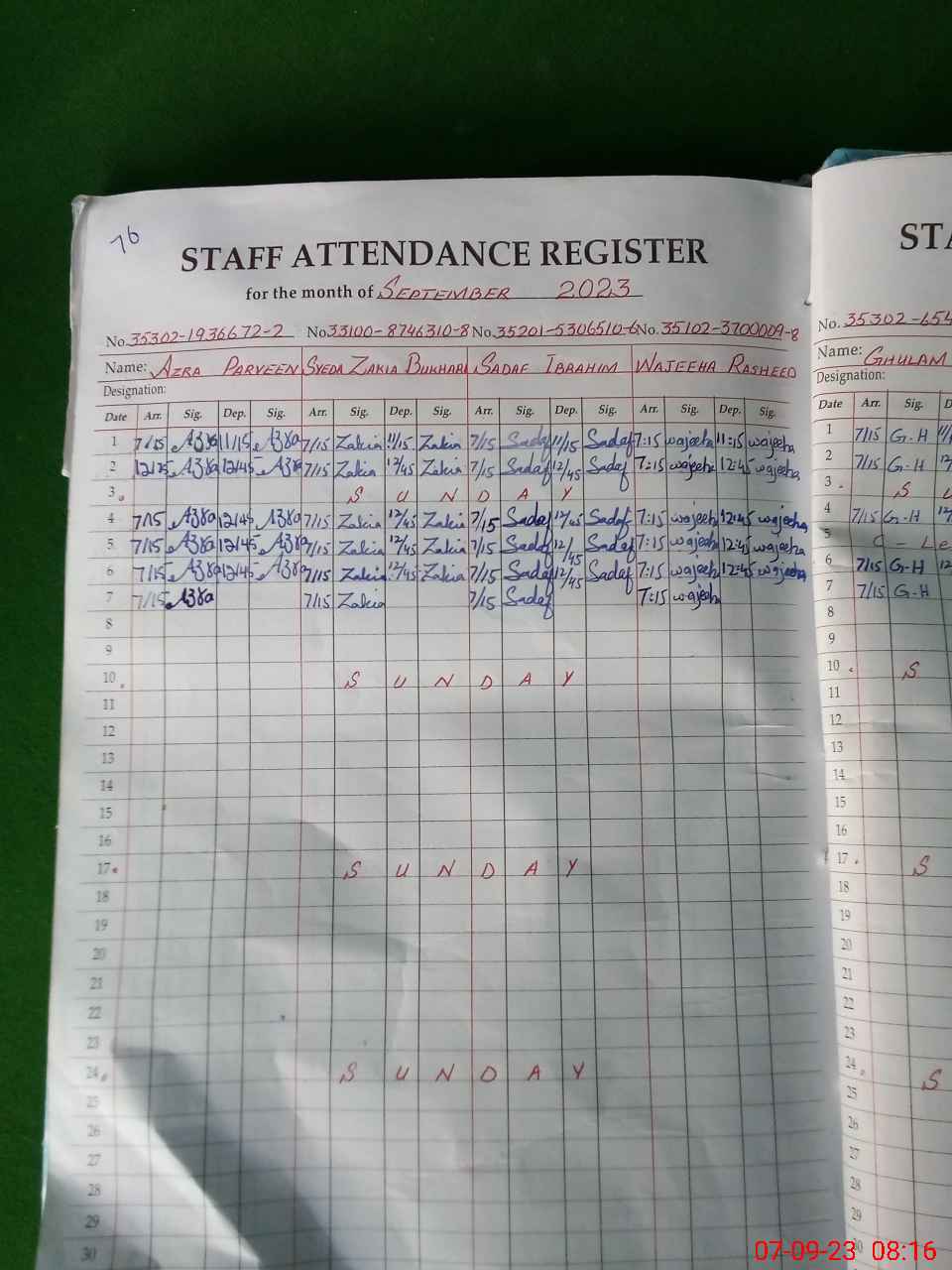 | CNIC | Full Name | Designation | R/C | Absence During Last Calender Month |