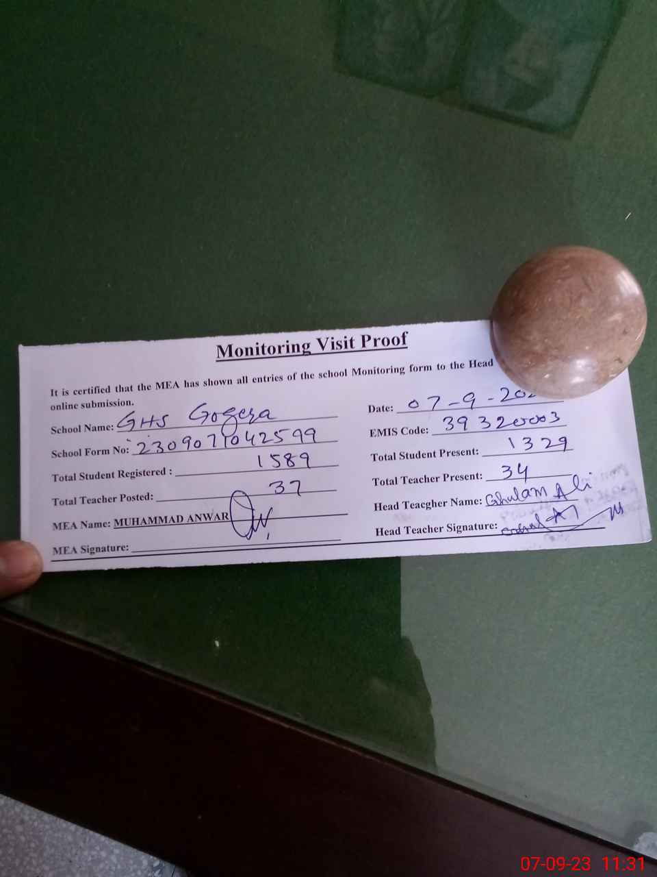 | Attendance Register | Head Teacher | MEA with School | Visit Proof |