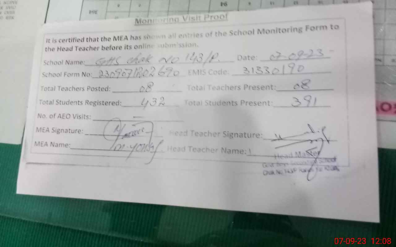 | Attendance Register | Head Teacher | MEA with School | Visit Proof |