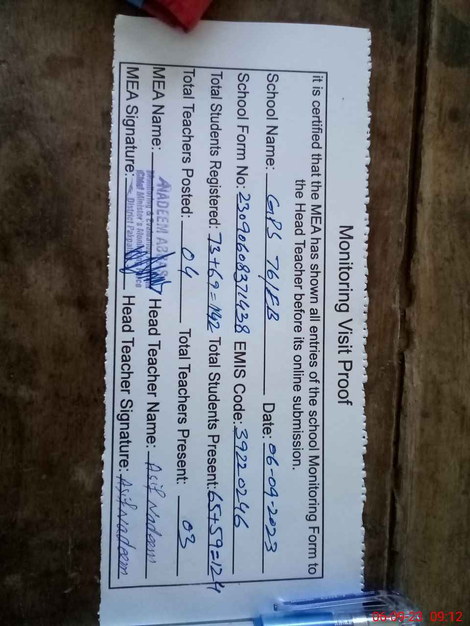| Attendance Register | Head Teacher | MEA with School | Visit Proof |