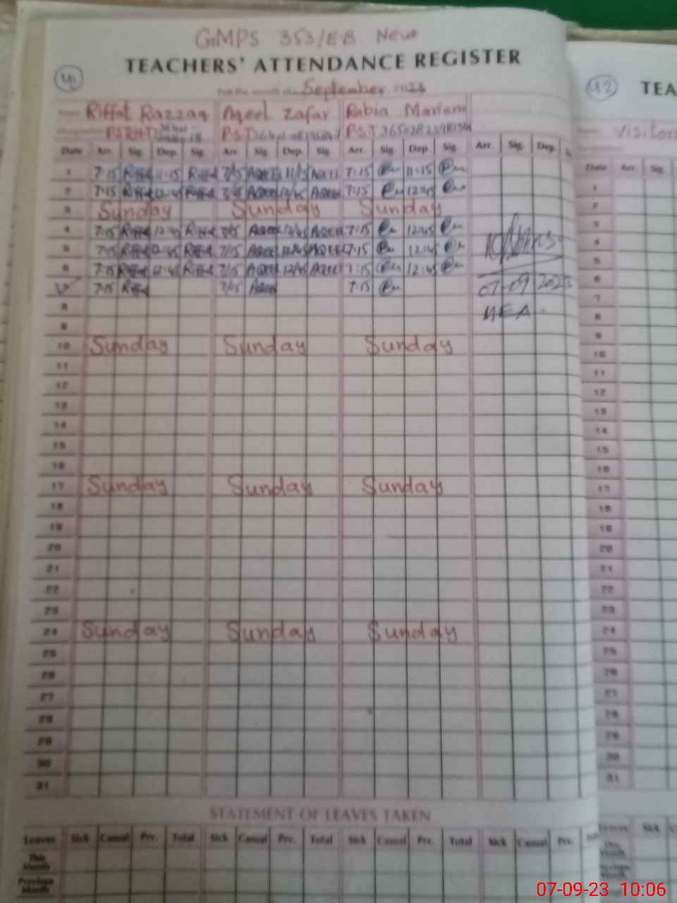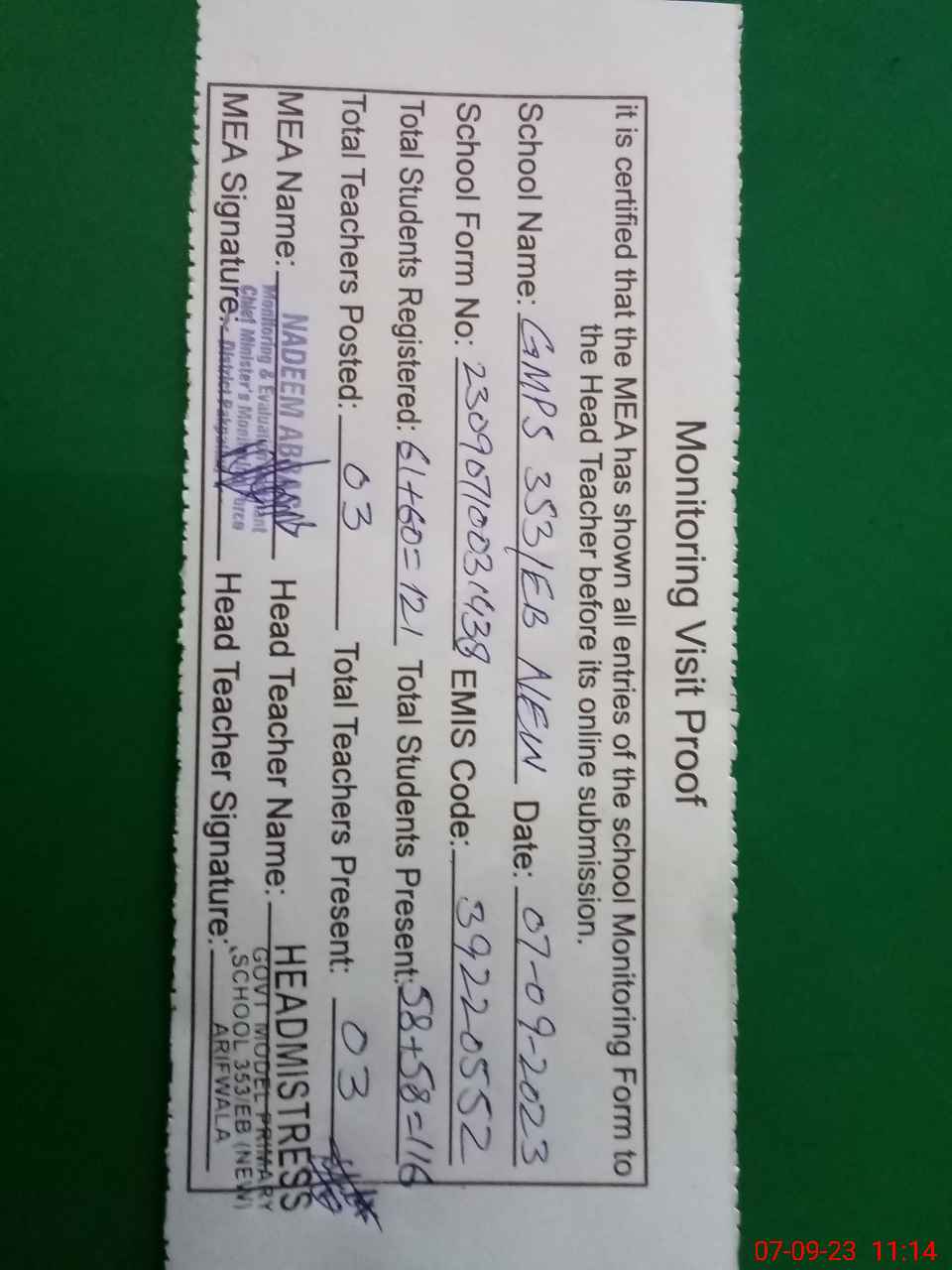 | Attendance Register | Head Teacher | MEA with School | Visit Proof |
