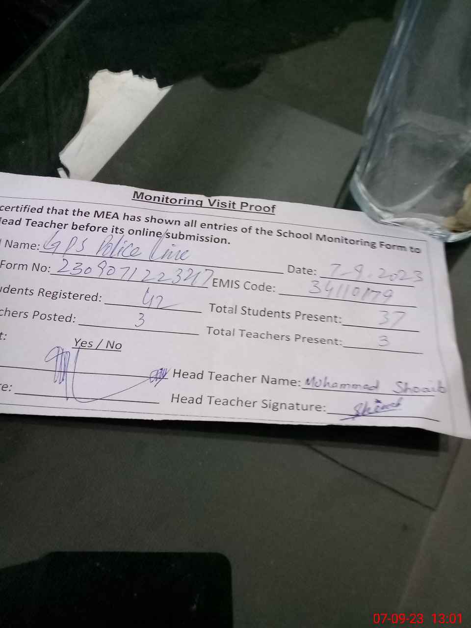 | Attendance Register | Head Teacher | MEA with School | Visit Proof |