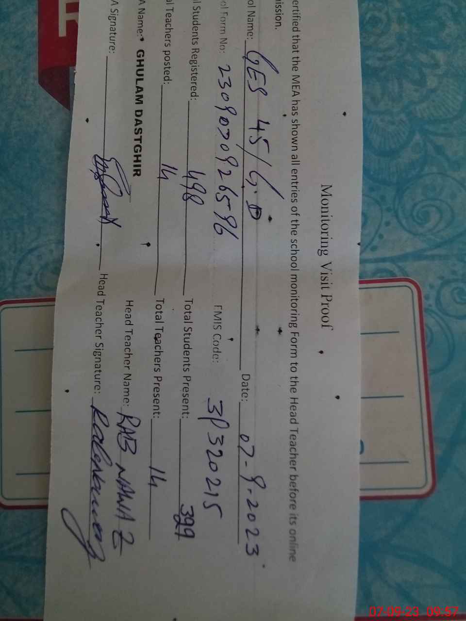 | Attendance Register | Head Teacher | MEA with School | Visit Proof |