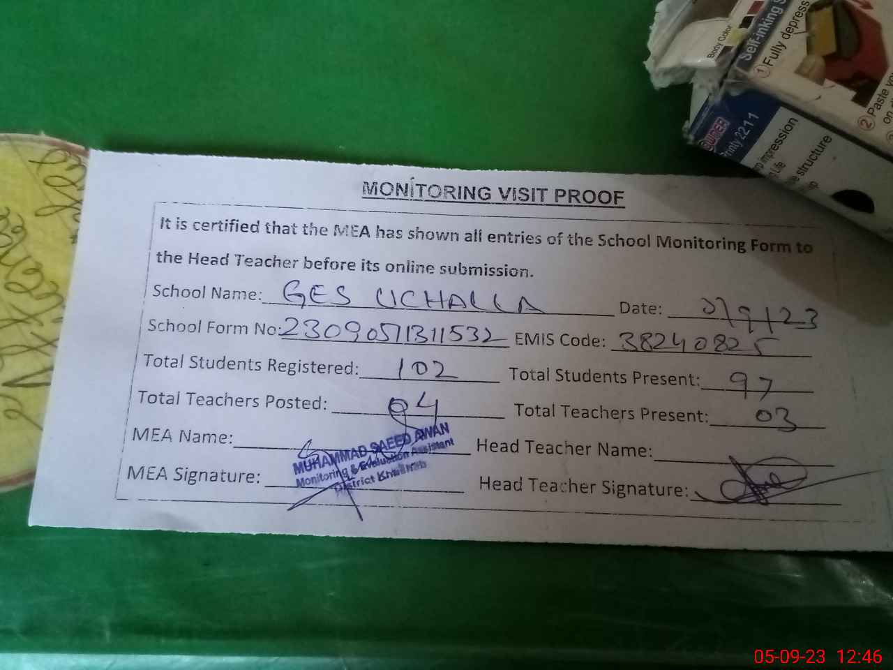 | Attendance Register | Head Teacher | MEA with School | Visit Proof |