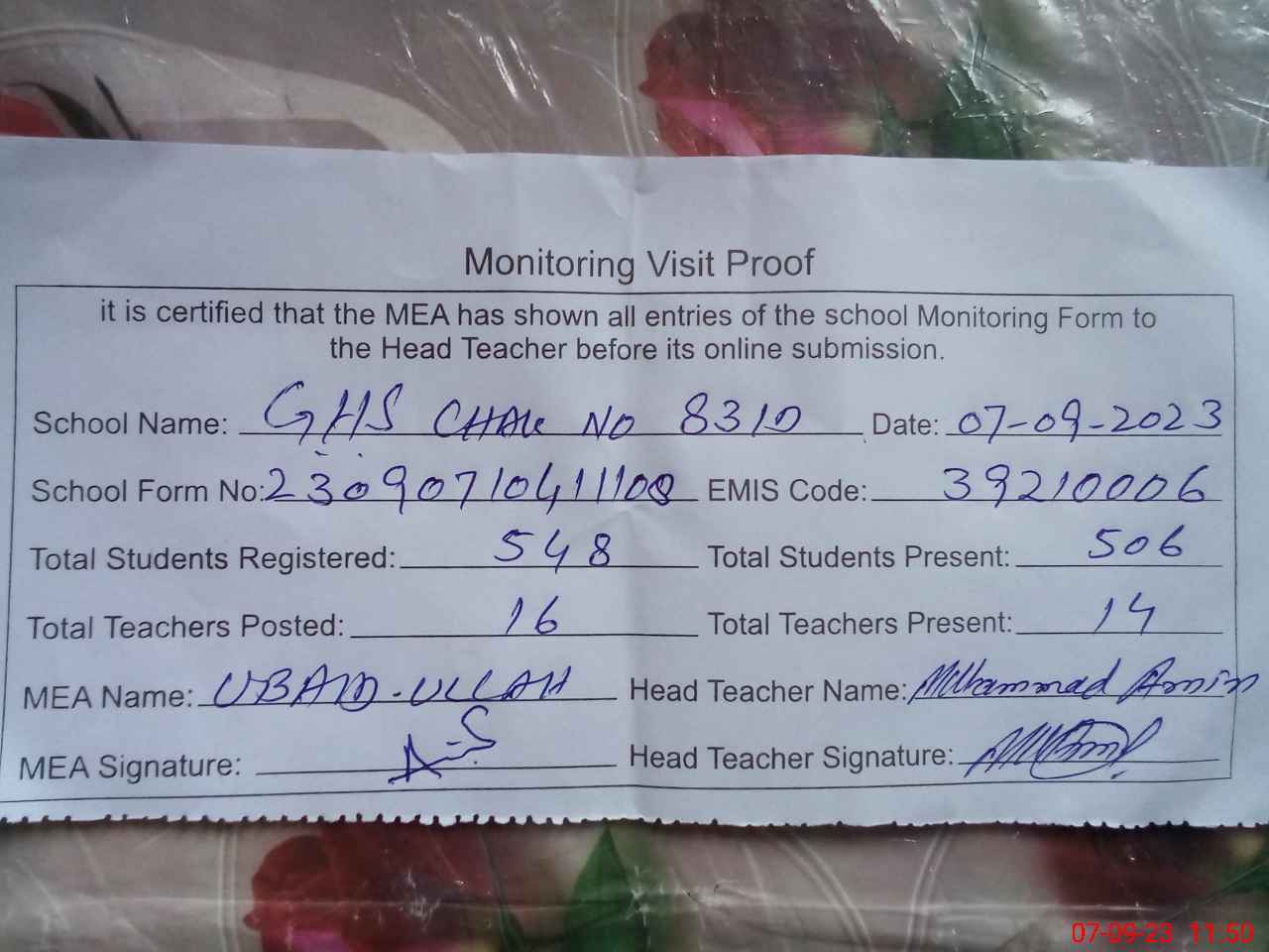 | Attendance Register | Head Teacher | MEA with School | Visit Proof |