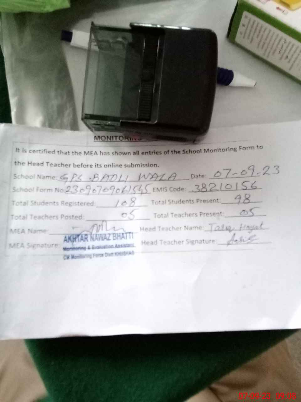 | Monitoring Date: 07-09-2023 | Start Time: 07-09-2023 08:33 AM | End Time: 07-09-2023 09:10 AM | Name of MEA: AK**** NA**** (R**** | |