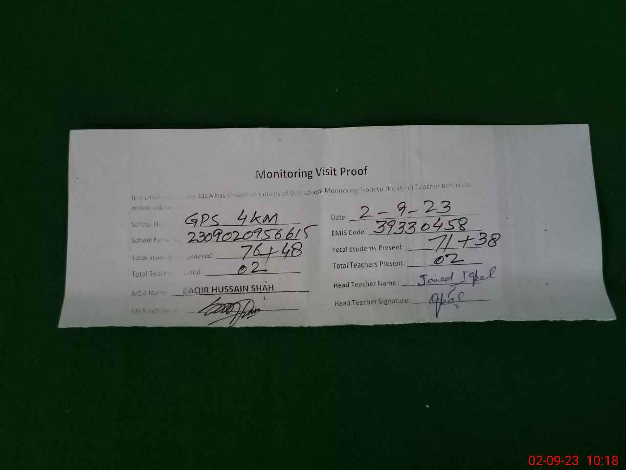 | Attendance Register | Head Teacher | MEA with School | Visit Proof |