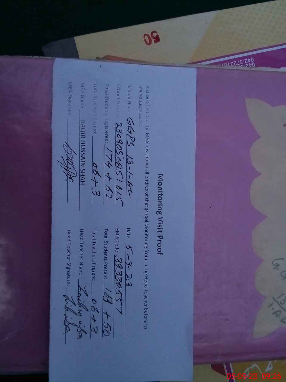 | Attendance Register | Head Teacher | MEA with School | Visit Proof |