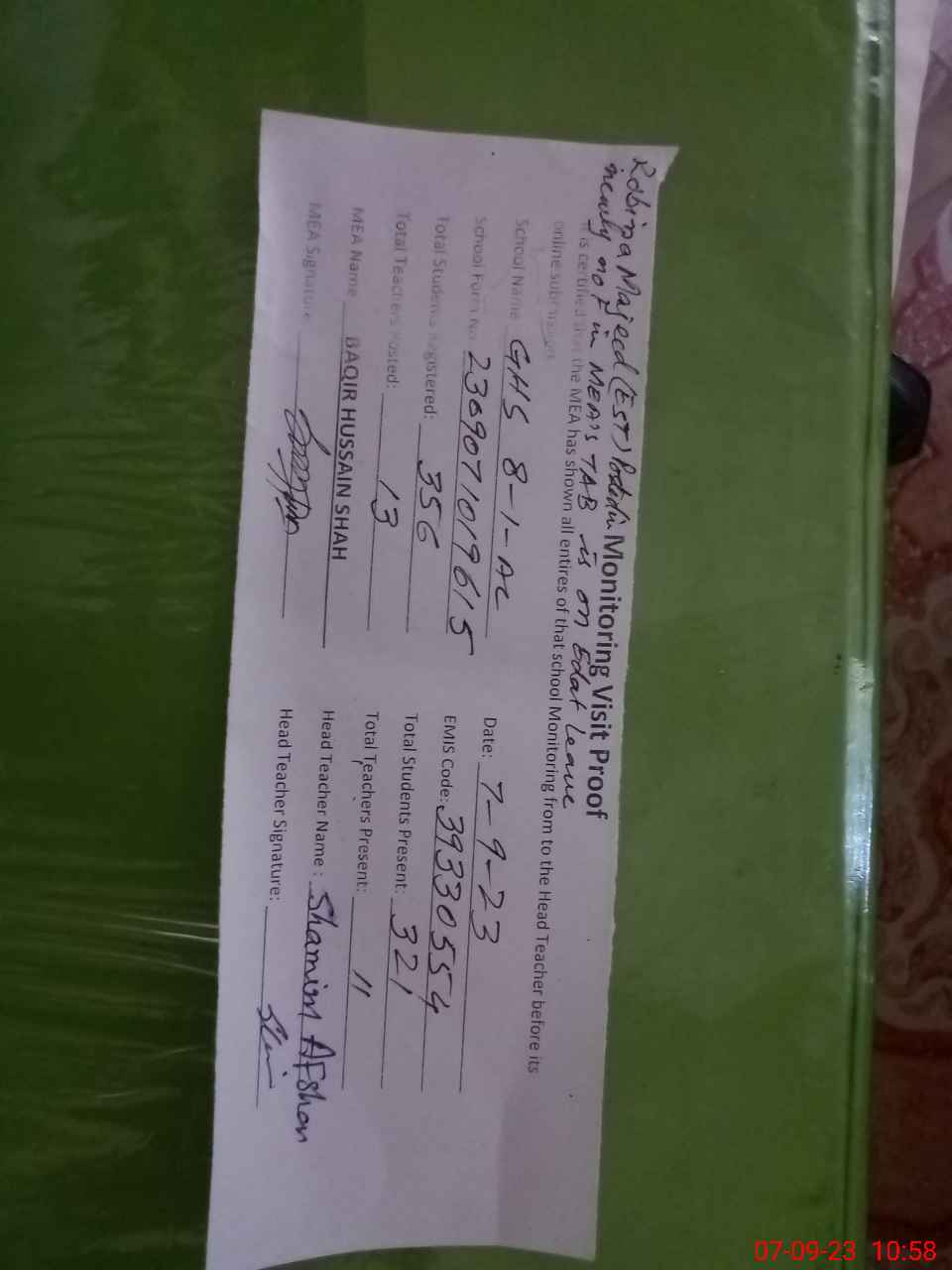 | Attendance Register | Head Teacher | MEA with School | Visit Proof |