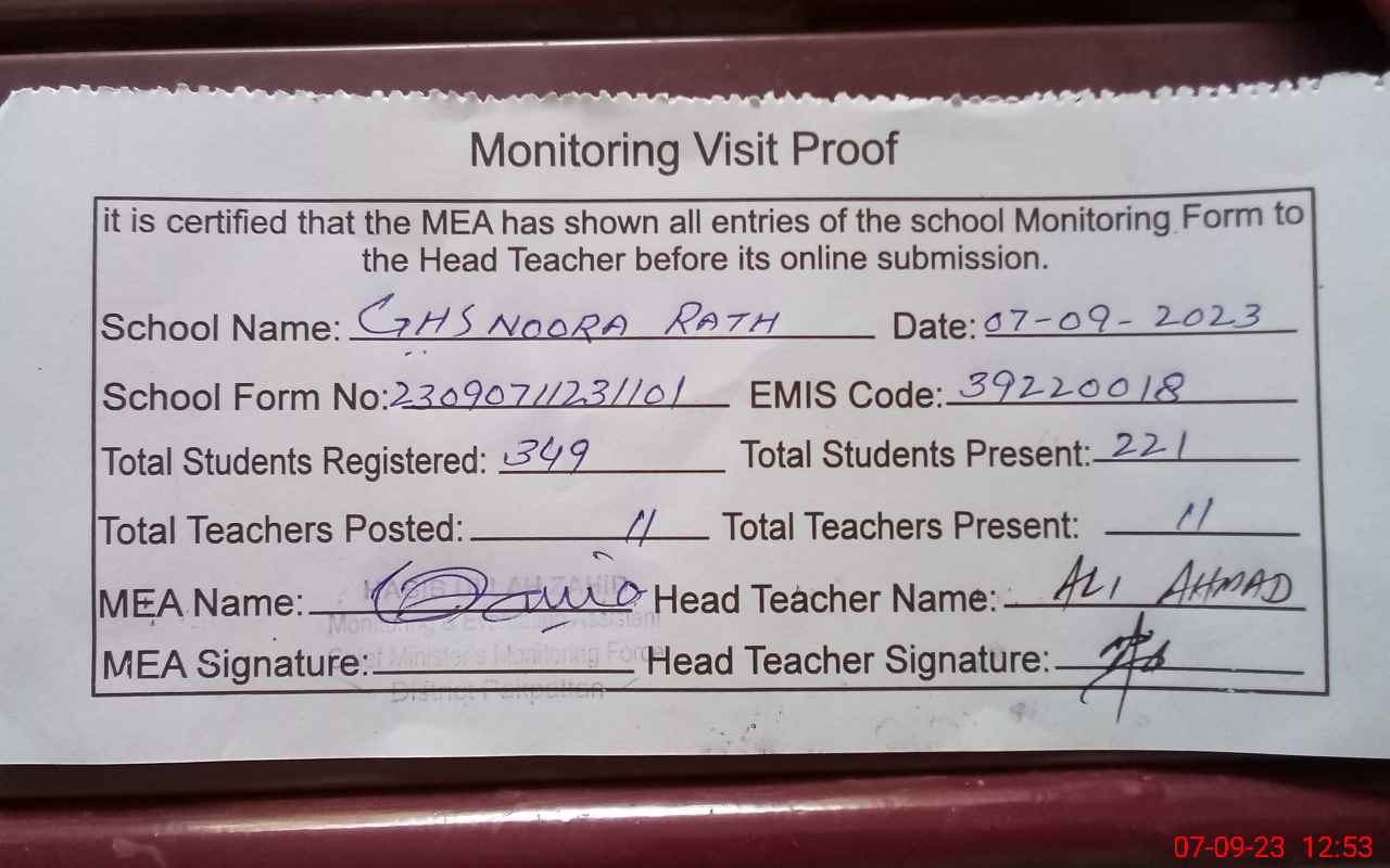 | EMIS Code: 39220018 | Name of School: GHS NOORA RATH | |||