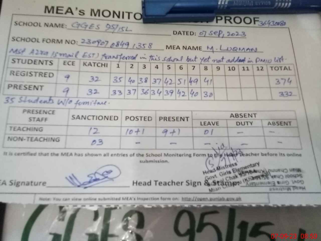 | Certified that this School was Inspected by the Undersigned MEA/DMO Today and the Information Stated Above is as Per Record. | |||||