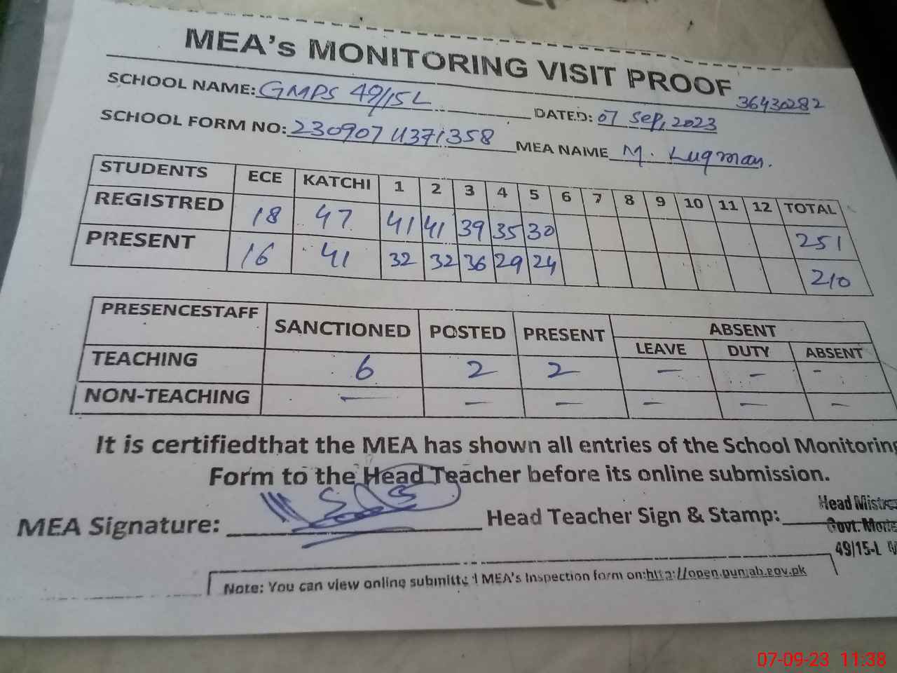 | Attendance Register | Head Teacher | MEA with School | Visit Proof |
