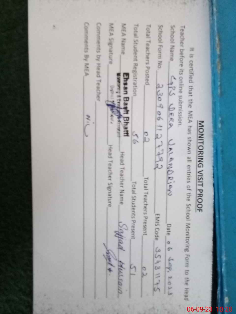 | Attendance Register | Head Teacher | MEA with School | Visit Proof |