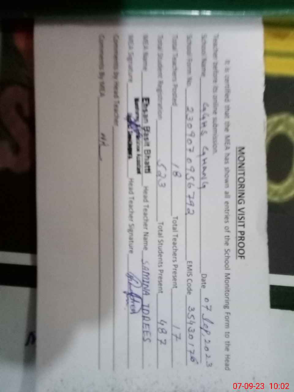 | Attendance Register | Head Teacher | MEA with School | Visit Proof |