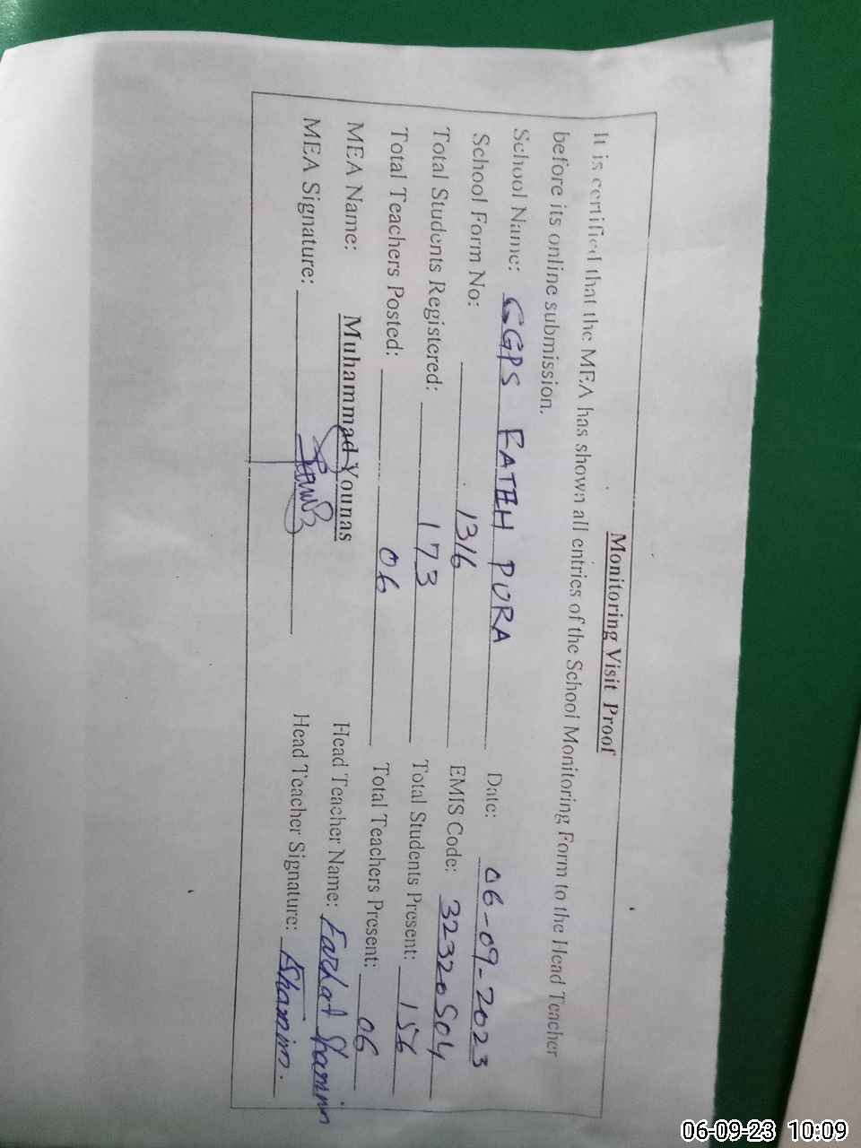 | Attendance Register | Head Teacher | MEA with School | Visit Proof |